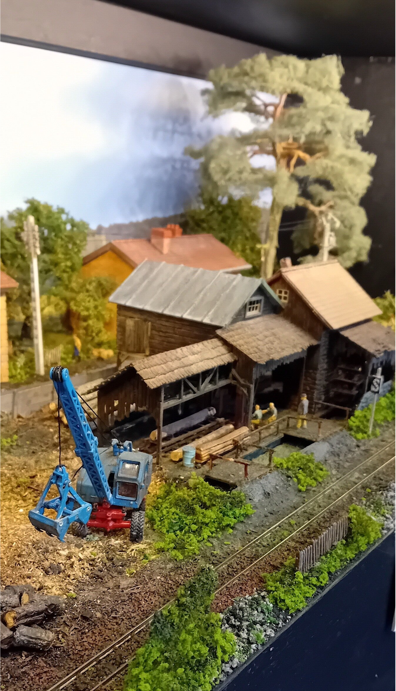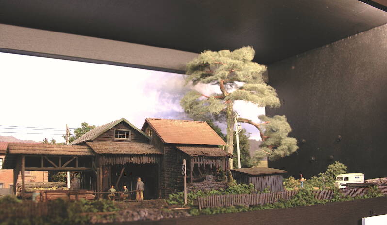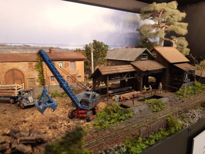 Un petit train en voie étroite disparaît derrière le décor et revient sur la gauche en débouchant d'un tunnel afin de longer la scierie, ancien modèle Faller, rescapée de Trinville.