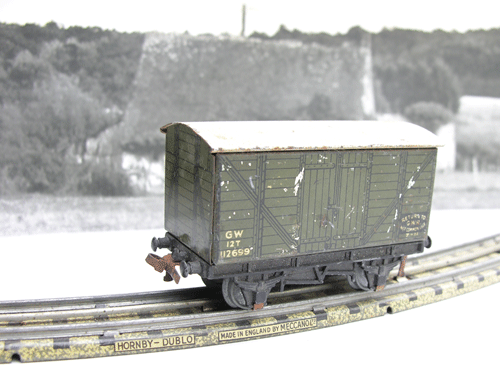 Hornby-Dublo et un wagon tinplate (fer blanc) de la même marque