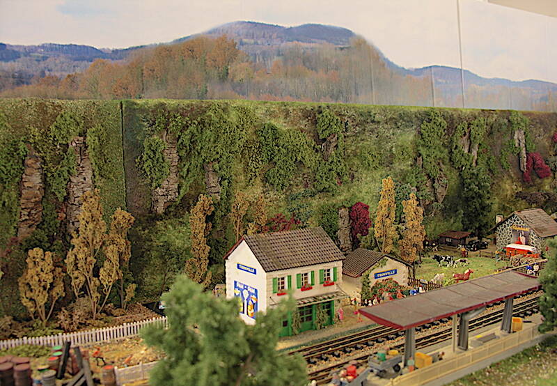 Le train Decauville occupe le premier, le deuxième accueille la gare et le troisième, une grande partie du village, le tout sur cinq mètres de long.
